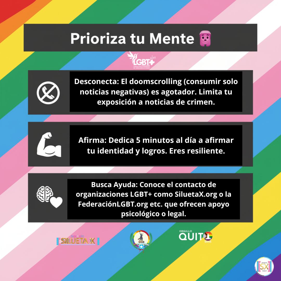 - Busca Ayuda Profesional y Comunitaria: No tienes que llevar la carga solx. Conoce y ten a mano los contactos de organizaciones LGBT+ que ofrecen apoyo psicológico, legal o comunitario. En Ecuador, puedes buscar a SiluetaX.org o FederaciónLGBT.org. Saber que hay profesionales y comunidades listos para apoyarte es un gran paso.